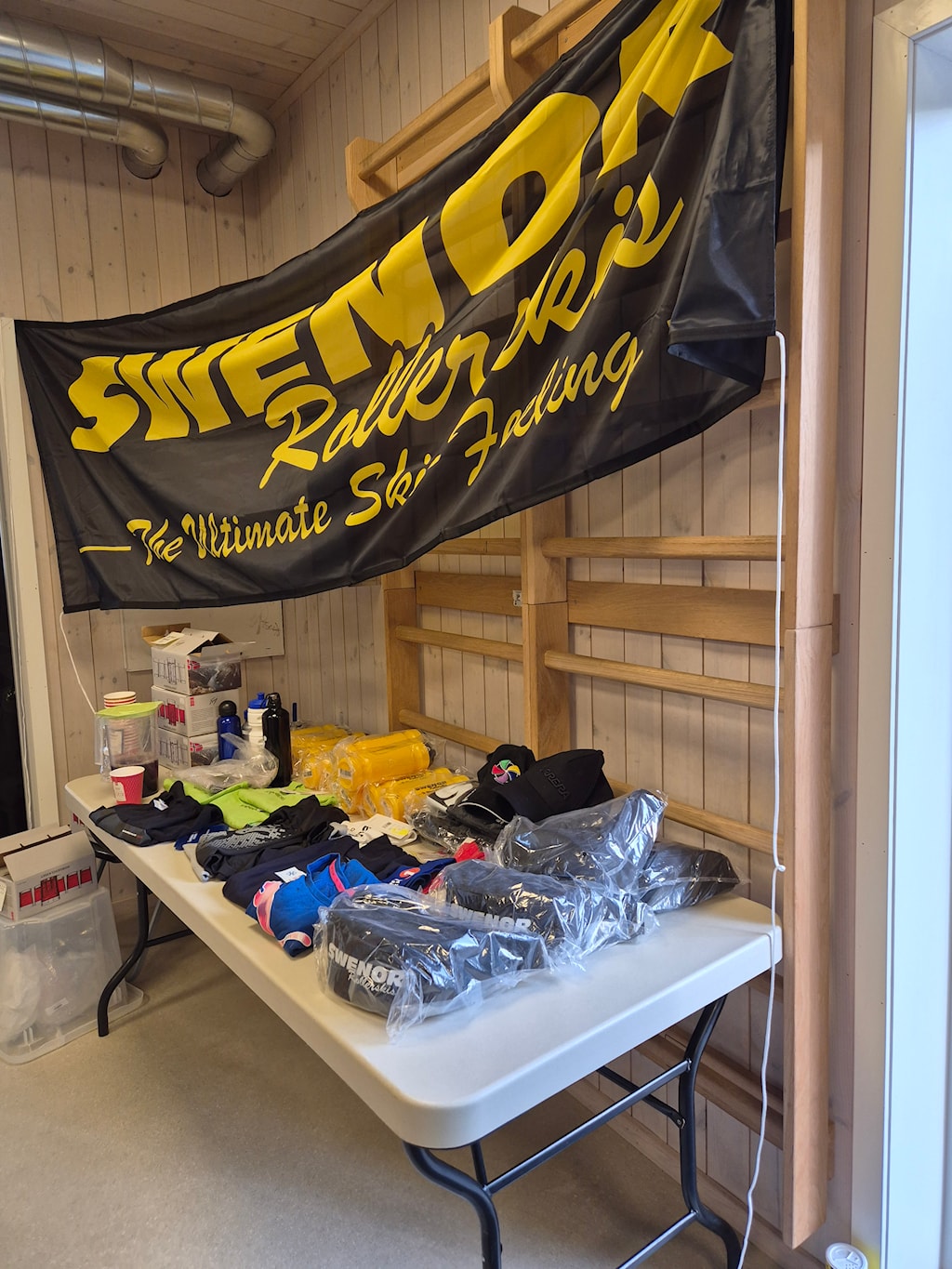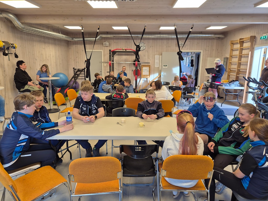 Forventningsfulle skiløpere samlet i treningsrommet og er klare for litt.............