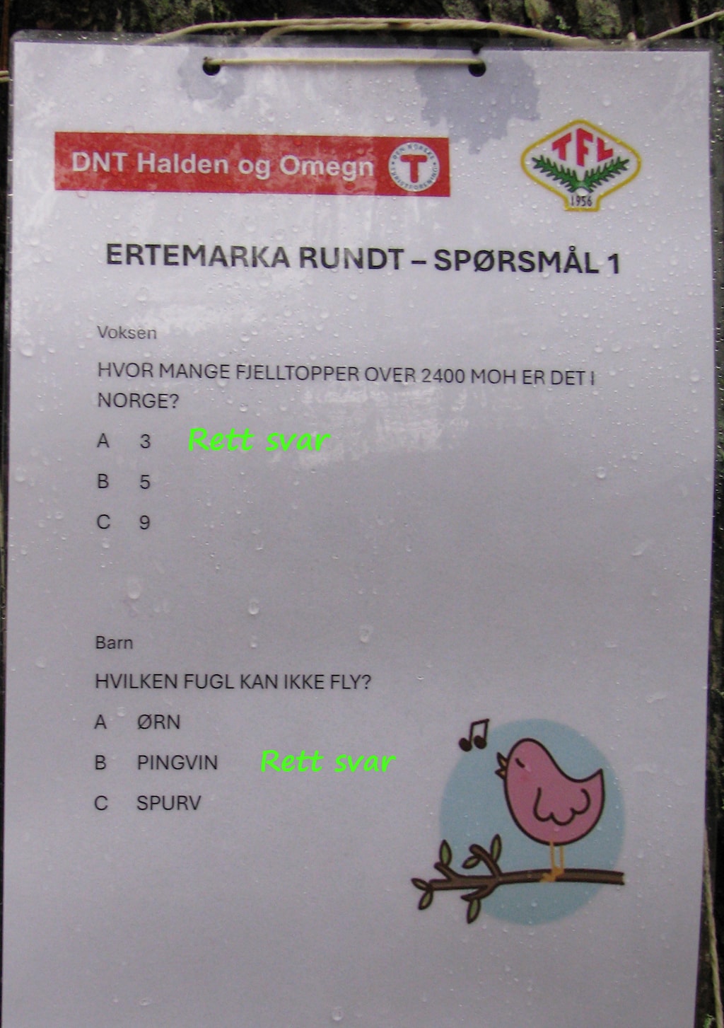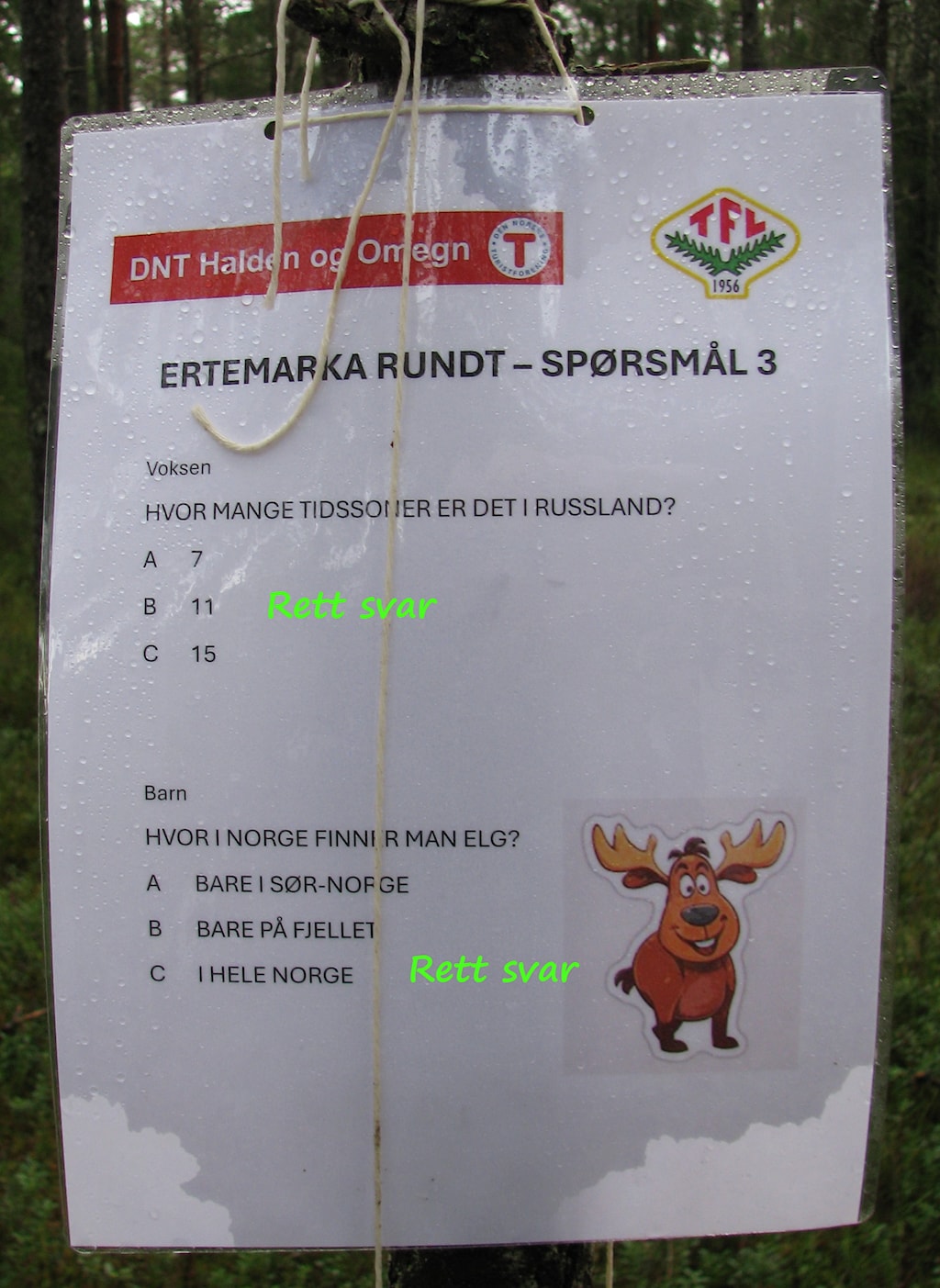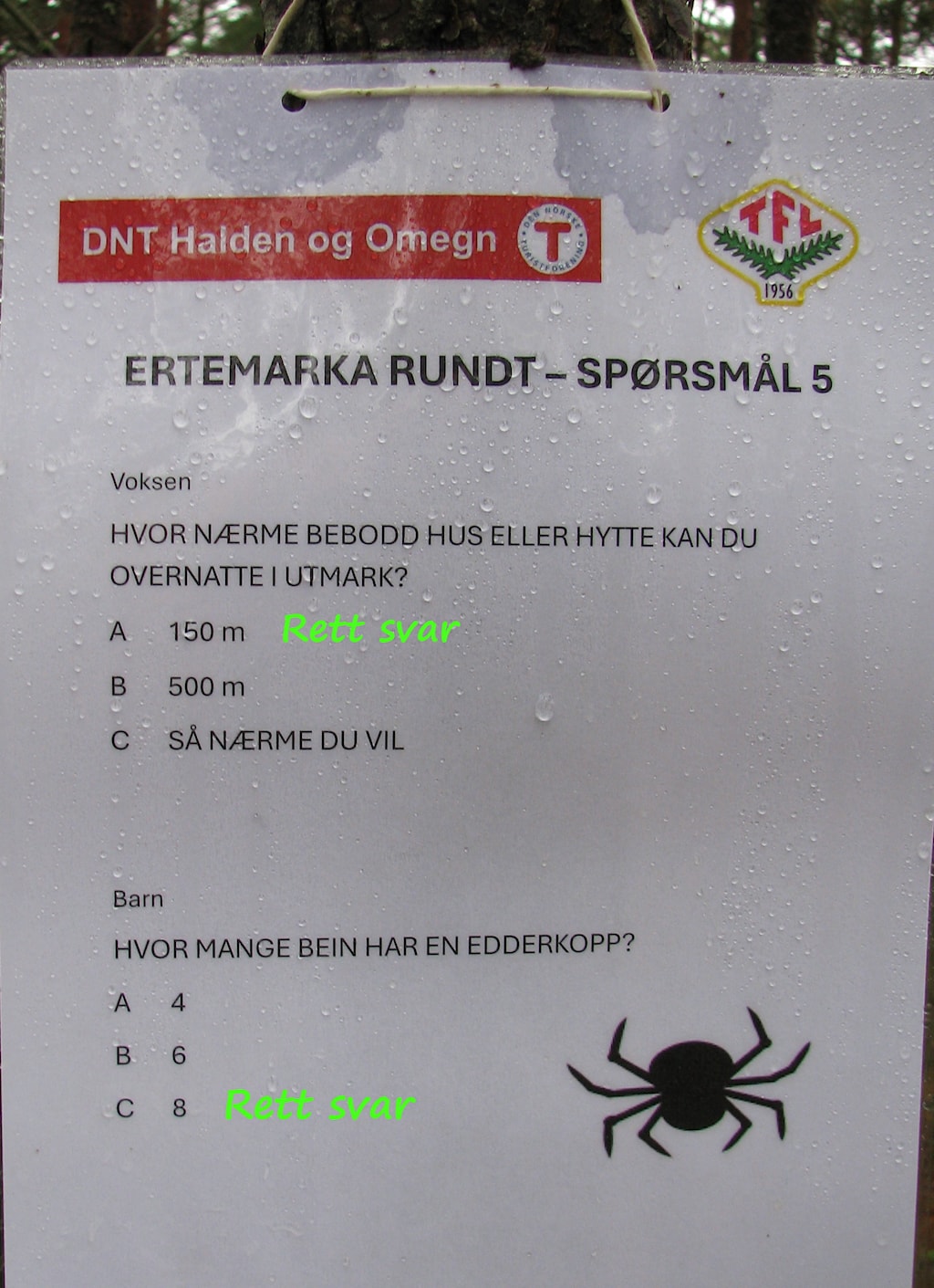 Det ble en din dag i Ertemarka for alle de som deltok i dag. Det var quiz både langs løypa rundt Lille Erte og langs veien opp til Ertehytta. Omtrent midtveis på stien hadde Tor-Arild og Viggo ordnet med bål, pølser og saft til barna og kaffe til de voksne. Ved Ertehytta ventet Turbo og Barnas Turlag med aktiviteter og leker. O-gruppa bød på et enkelt, lite o-løp.