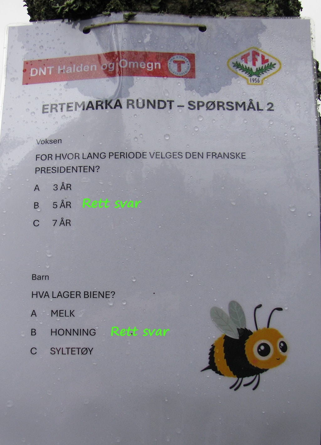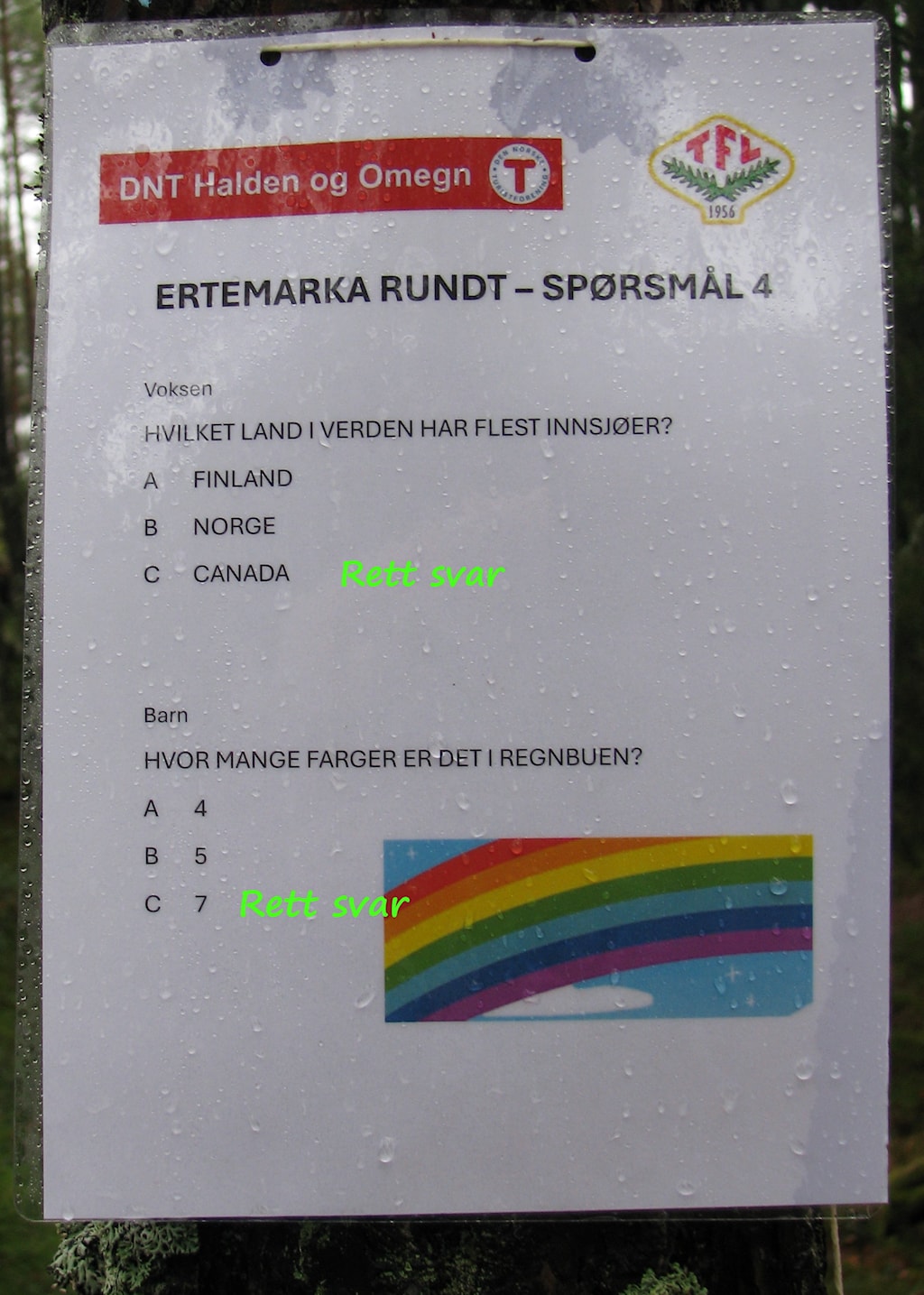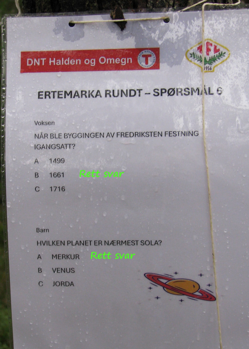 Det ble en din dag i Ertemarka for alle de som deltok i dag. Det var quiz både langs løypa rundt Lille Erte og langs veien opp til Ertehytta. Omtrent midtveis på stien hadde Tor-Arild og Viggo ordnet med bål, pølser og saft til barna og kaffe til de voksne. Ved Ertehytta ventet Turbo og Barnas Turlag med aktiviteter og leker. O-gruppa bød på et enkelt, lite o-løp.