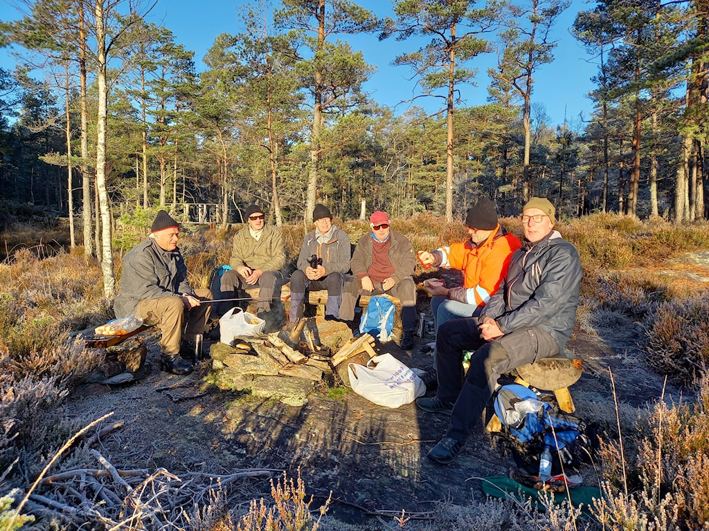 Løypegruppa har en fortjent juleavslutning med pølsebål ved Sagtjern! I høst har gruppa ryddet og nymerket flere km. med stier i Ertemarka, reparert klopper og nå sist gjort klart for løypekjøring til vinteren når snøen forhåpentligvis kommer. F.v.: Hans Nossen, Egil Helberg, Jan-Otto Johnsen, John Lundqvist, Erik Windt, Morten Jensen. Foto: Morten Skadsem.