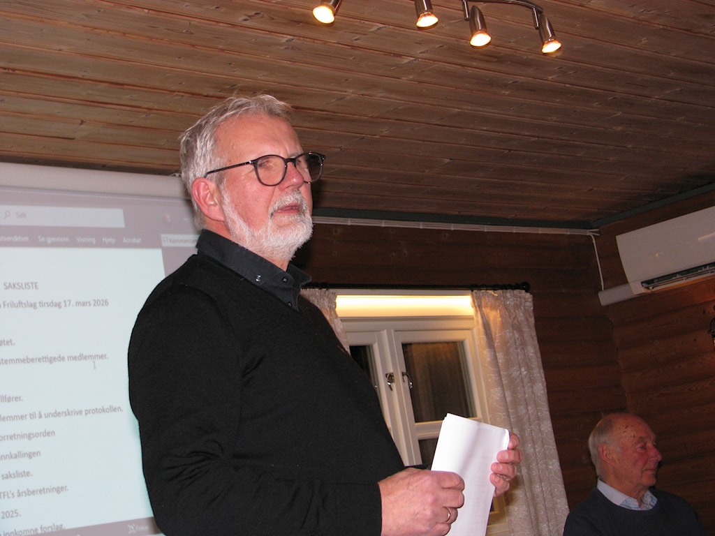 Leder Kjell Bernstrøm ønsket 36 medlemmer velkommen til TFLs årsmøte på Ertehytta tirsdag kveld. Det hegynte med ett minutts stilhet for medlemmer som var gått bort i 2025, blant dem Æresmedlem og en av stifterne av laget i 1956, Bjørn Larsen.