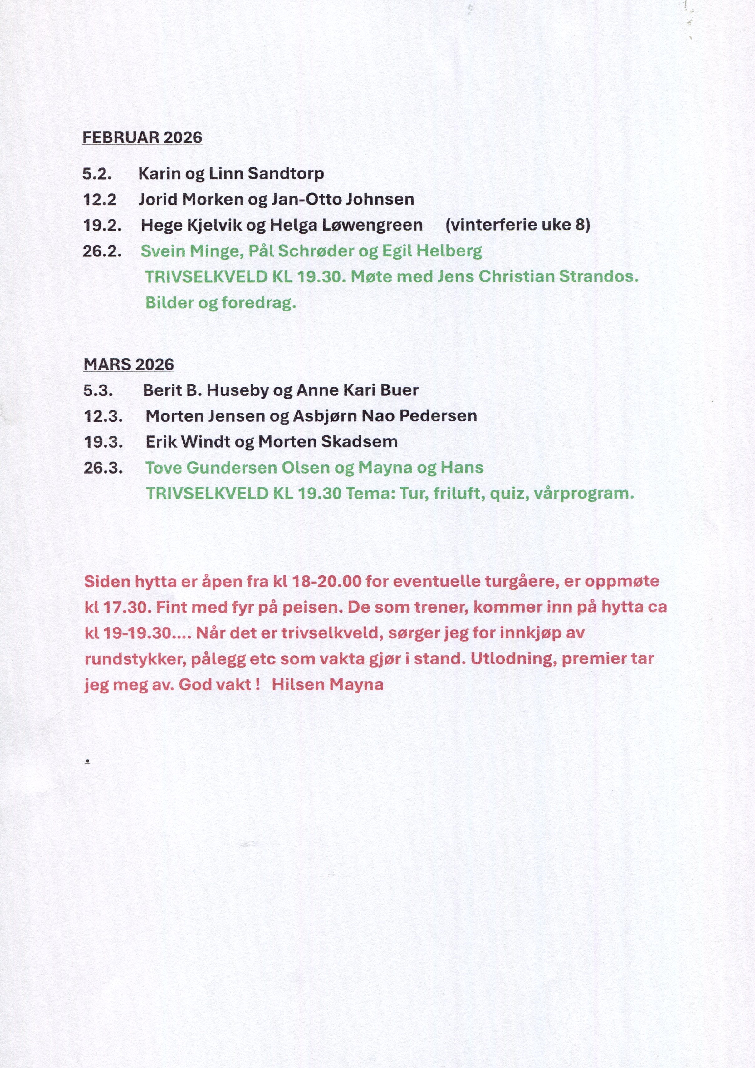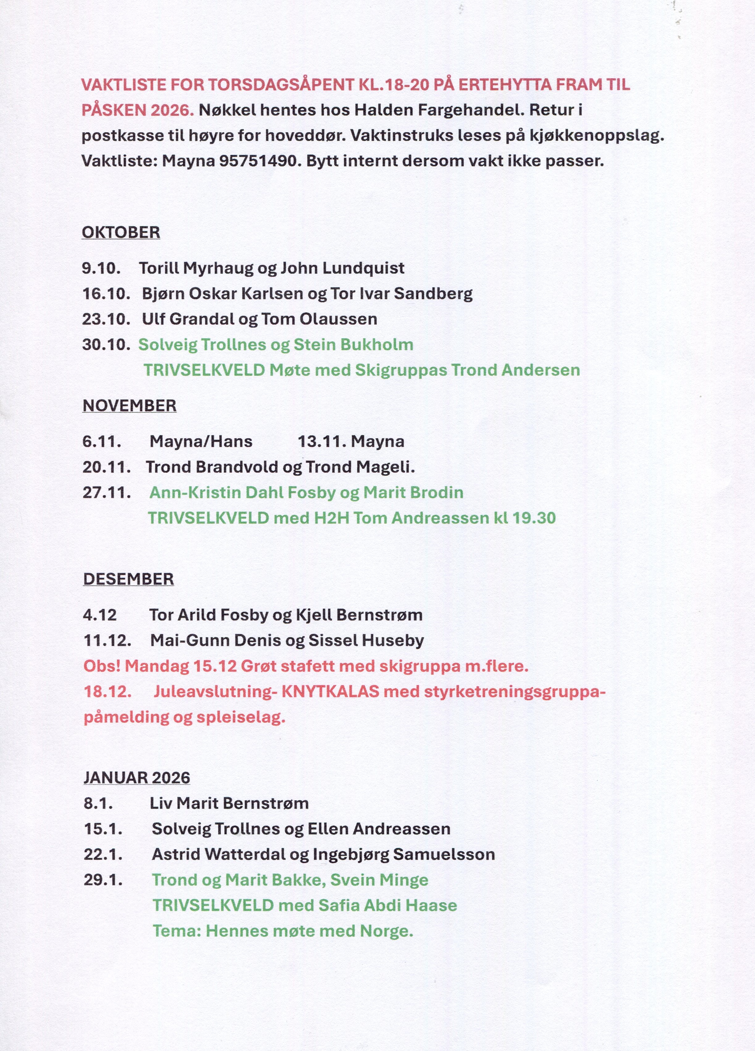 HYTTEVAKTLISTE – ERTEHYTTA 2025/2026 | |